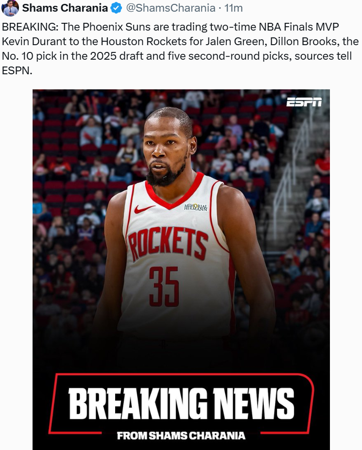 据悉,太阳队将杜兰特交易至休火箭队,换来杰伦-格林、狄龙-布鲁克斯、2025 年选秀大会的第10顺位以及五个次轮选秀权。